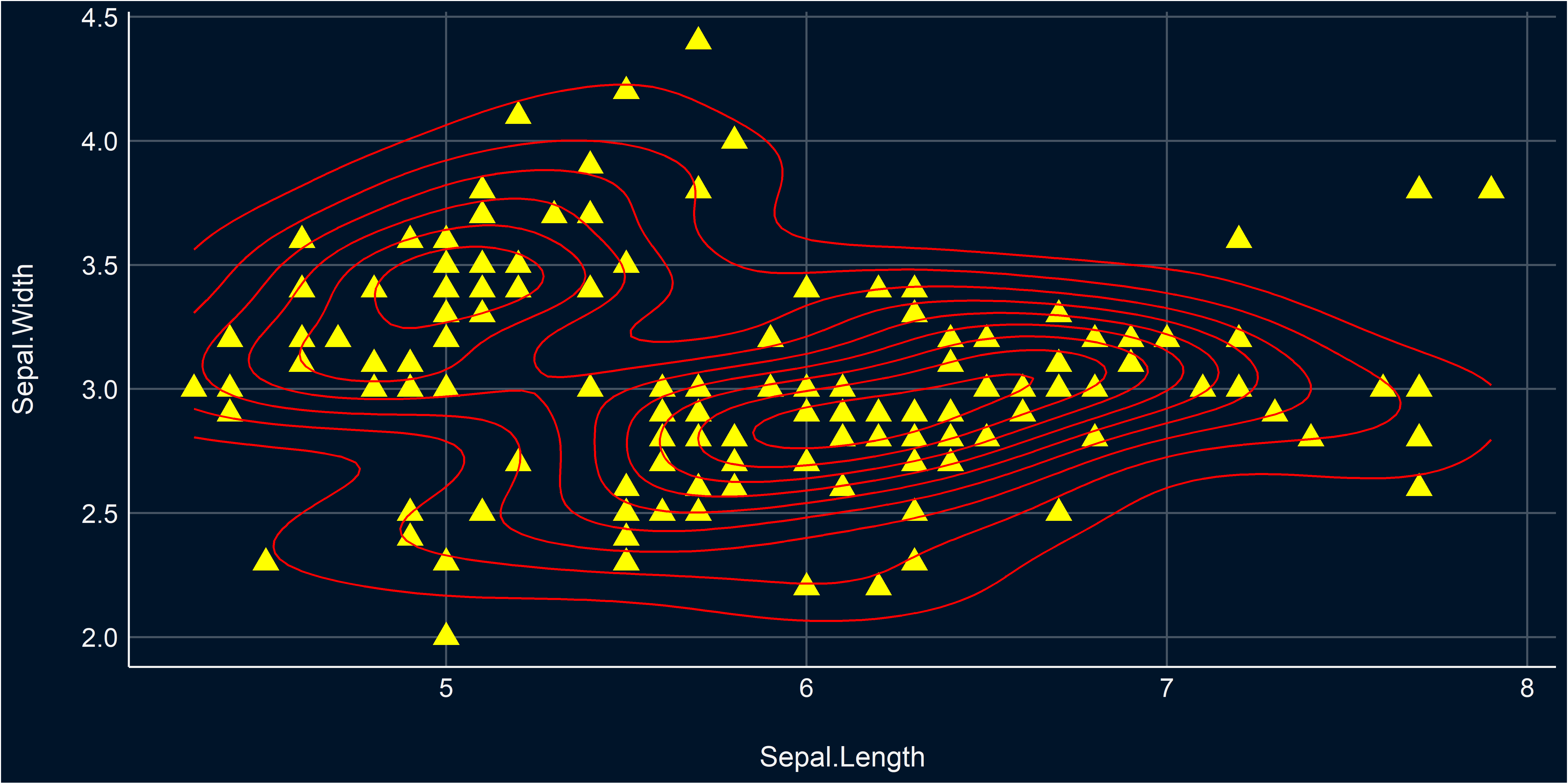 ggplot() +geom_point(data=iris, aes(x = Sepal.Length, y = Sepal.Width)) +geom_density_2d(data=iris, aes(x = Sepal.Length, y = Sepal.Width)) +theme_classic()
