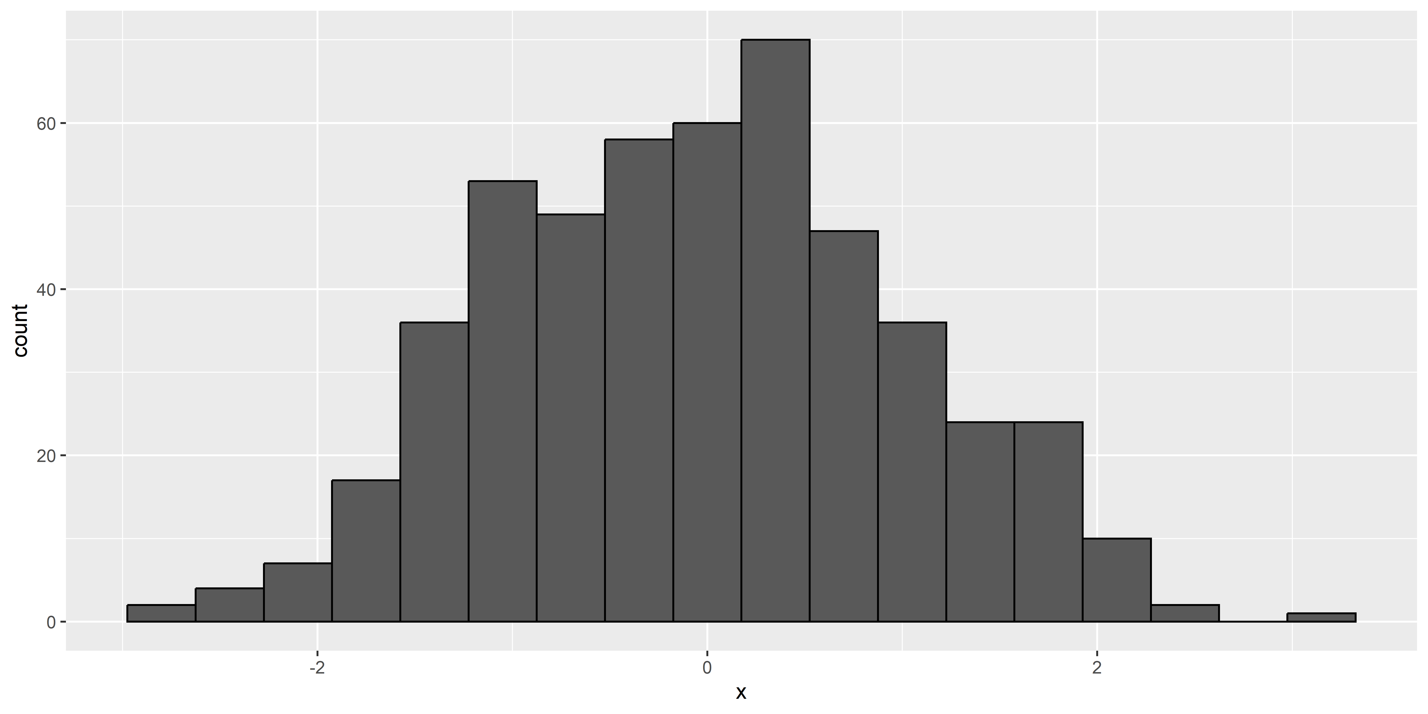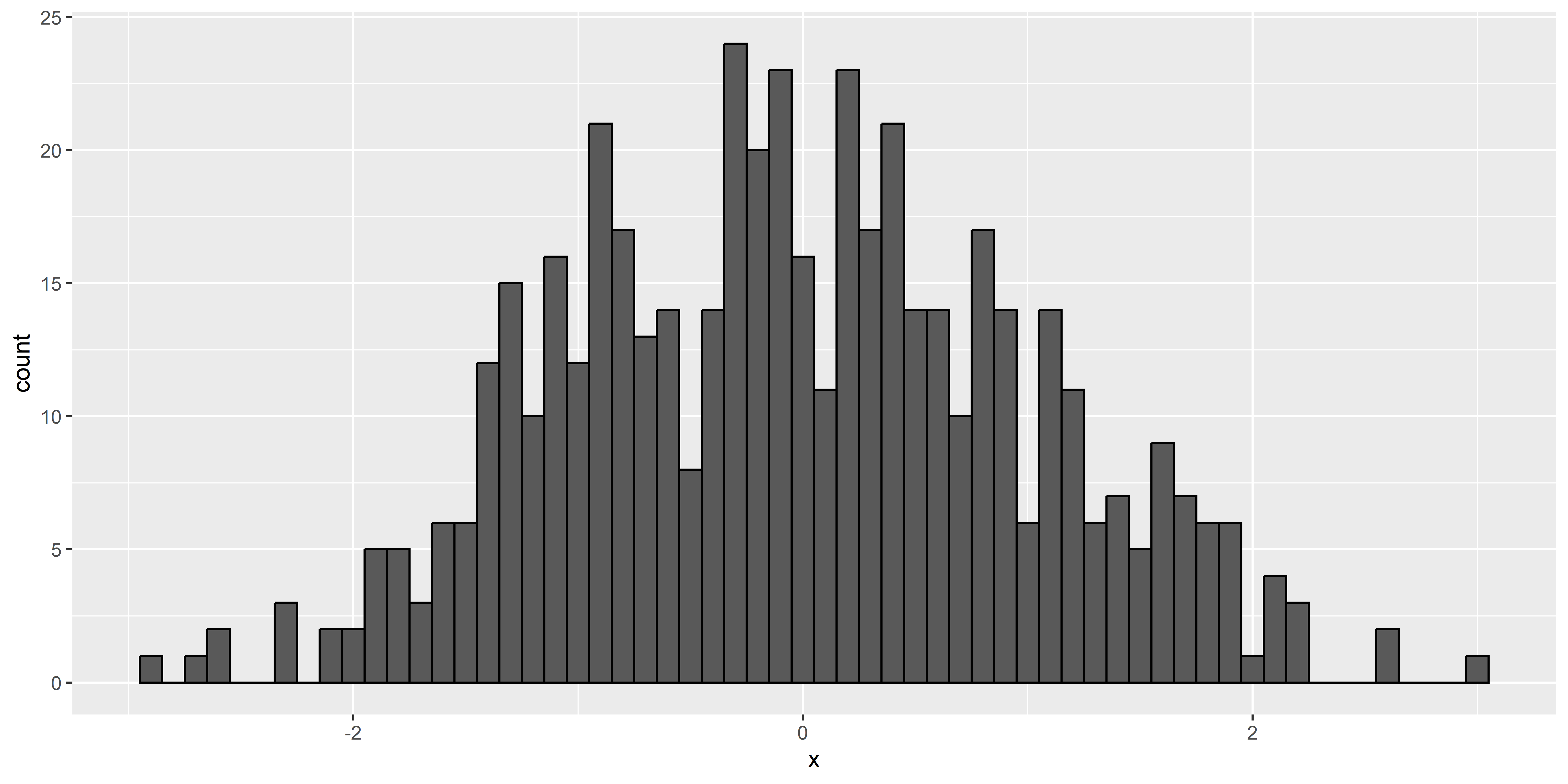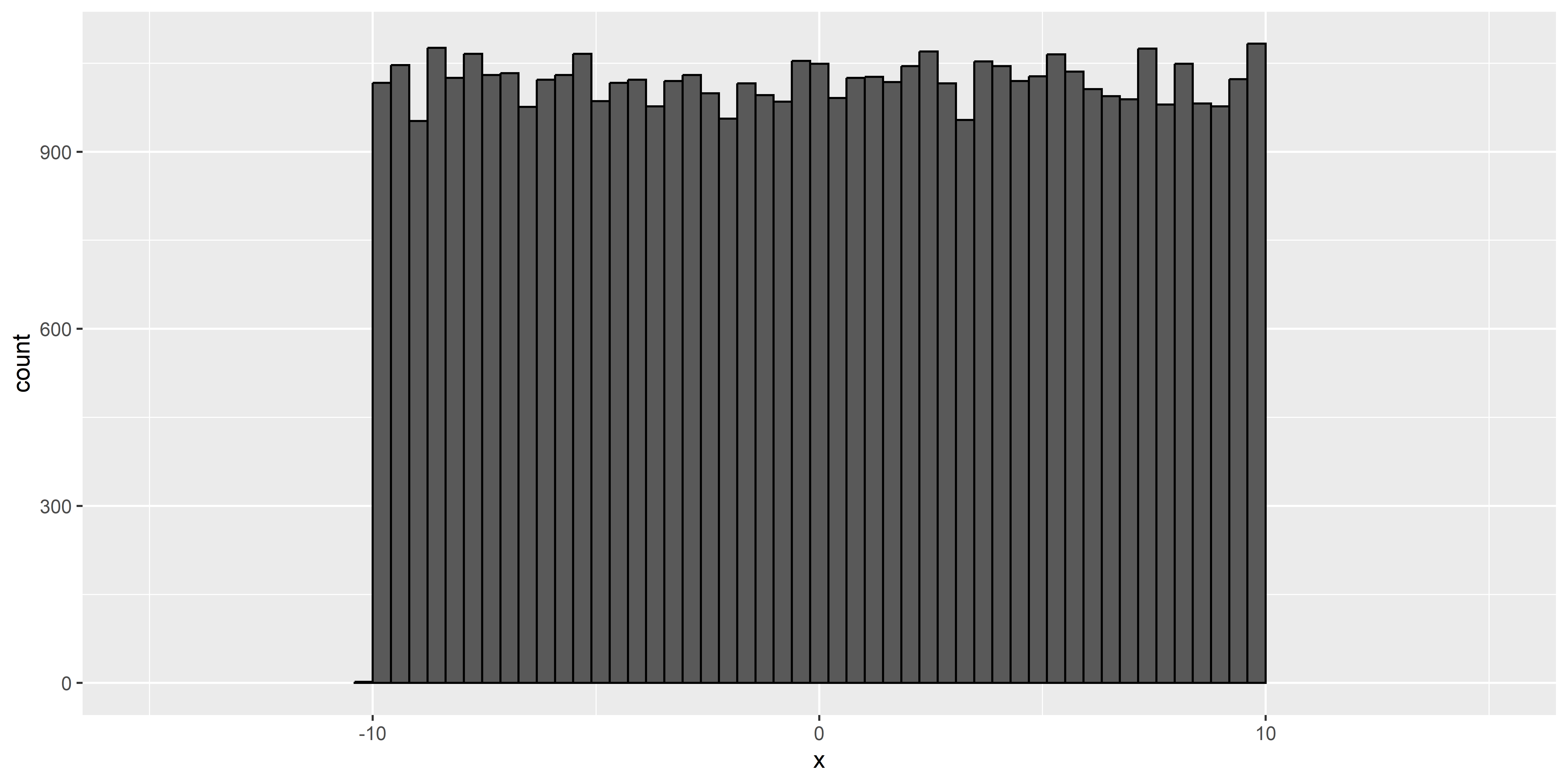 # Use runif(): random + uniformdata.frame(x =runif(50000, min=-10, max=10)) |>ggplot(aes(x=x)) +geom_histogram(bins =50, color="black") +coord_cartesian(xlim=c(-15, 15))