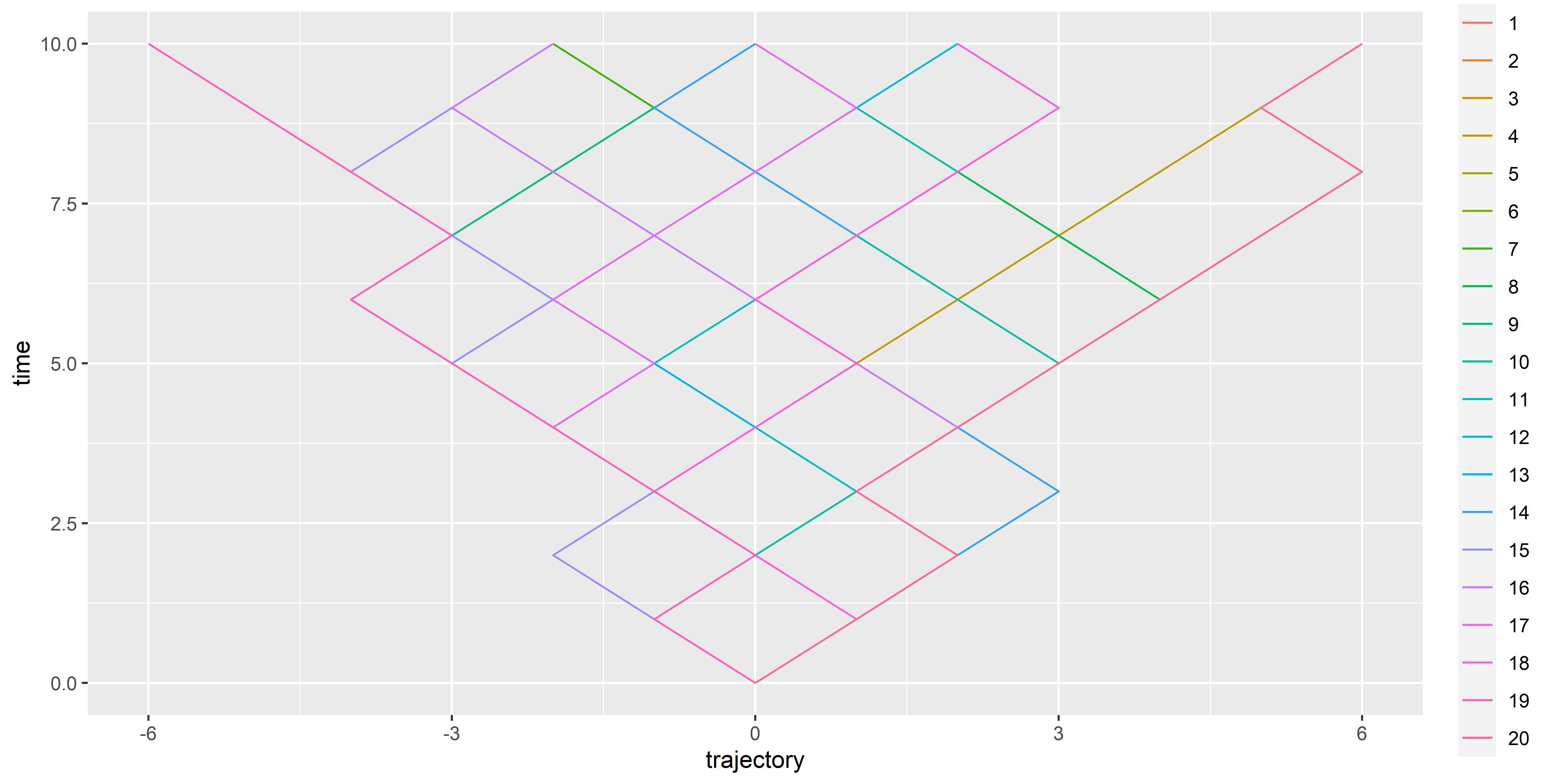 data <-data.frame() # Initialize empty data framefor(i in1:20) { walk_data <-data.frame(trajectory =random_walk(10),time =seq(0, 10),iteration = i ) data <-rbind(data, walk_data)}data