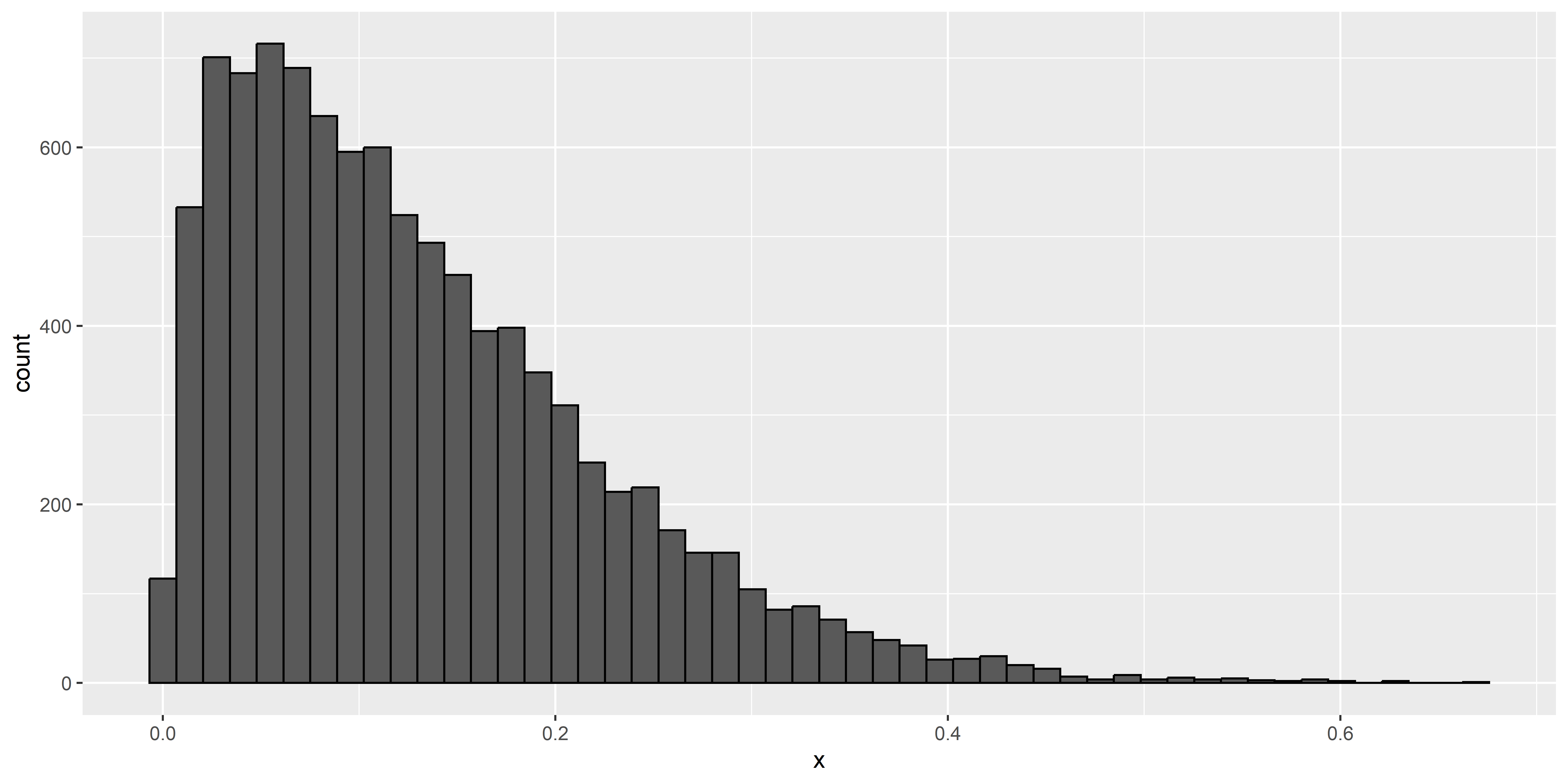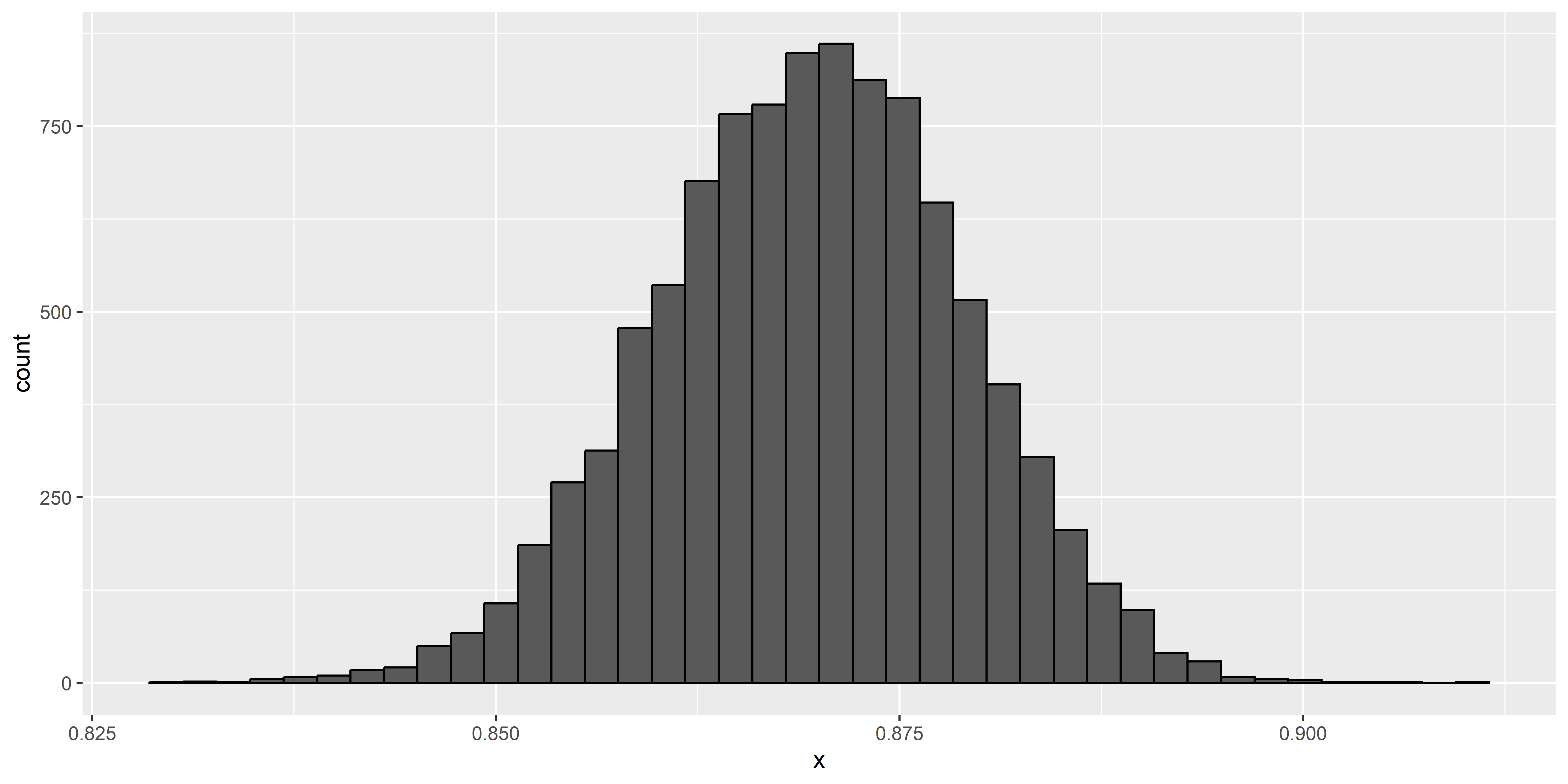 means <-c()for(i in1:10000) { x <-rbeta(100, shape1 =10, shape2 =1.5) means <-c(means, mean(x))}data.frame(x = means) |>ggplot(aes(x=x)) +geom_histogram(bins=40, color="black")